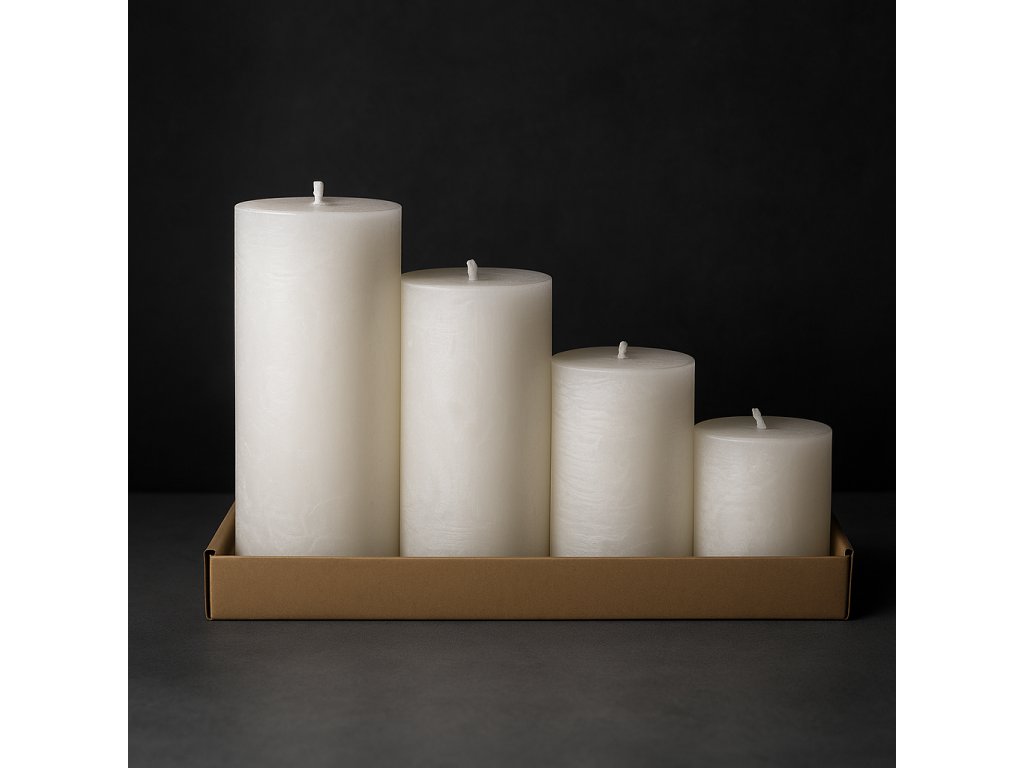 - Rozměry svíček (průměr/výška): 55 mm / 65 mm, 95 mm, 125 mm, 155 mm – postupně rostoucí velikosti vytvářejí harmonický vizuální efekt.